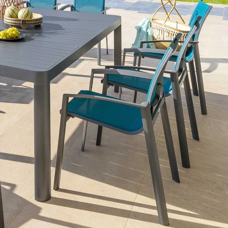 Pour des repas en plein air, installez vous confortablement dans un fauteuil extérieur Axant coloris bleu canard/graphite de la marque Hespéride.